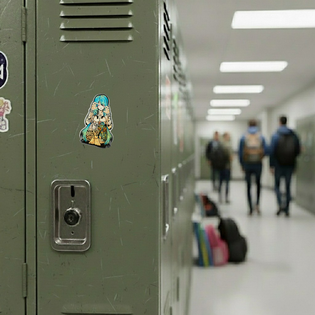 This mesmerizing sticker from B-Side Label blends sensuality, rebellion, and introspection in one unforgettable design. The character’s striking turquoise hair and detailed tattoos — featuring dragons and swirling motifs — symbolize strength, vulnerability, and the courage to face inner truths.