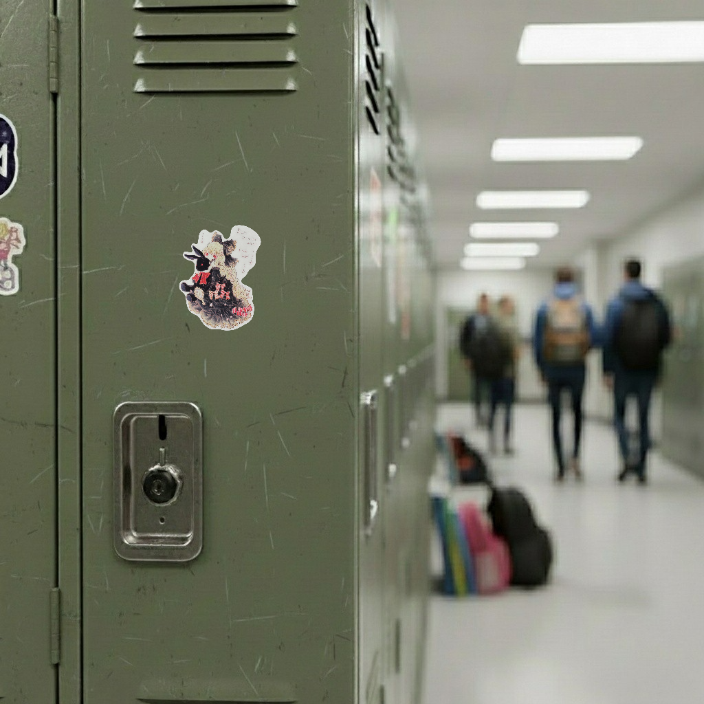 Delicately eerie and heartbreakingly sweet, this sticker features a pale-haired girl clinging to her plush rabbits — her eyes soft, her message whispered: “Don’t leave me alone.” The vintage lace dress, oversized bow, and muted tones give it a hauntingly beautiful, gothic-lolita aesthetic that feels straight out of a fairytale dream.