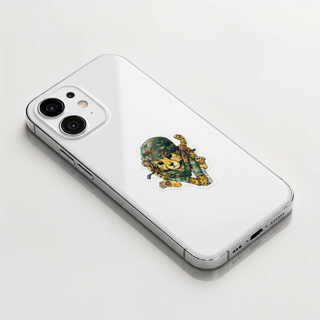 This striking sticker captures a cheetah dressed in full combat gear, a fierce yet heartfelt reminder of self-preservation and courage. With its camouflage helmet, uniform, and gentle eyes, this piece balances strength with vulnerability—a perfect reflection of B-Side Label’s ability to tell a story through expressive design.