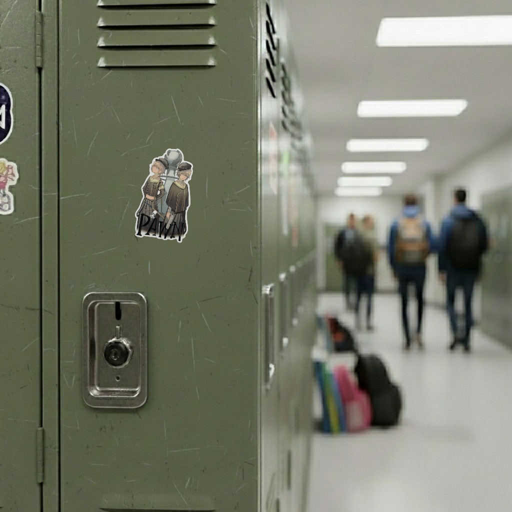 This atmospheric B-Side Label sticker features two somber figures standing before a massive pawn chess piece — a haunting visual metaphor for strategy, sacrifice, and fate. With muted tones and refined shading, it carries a quiet intensity that draws you in.