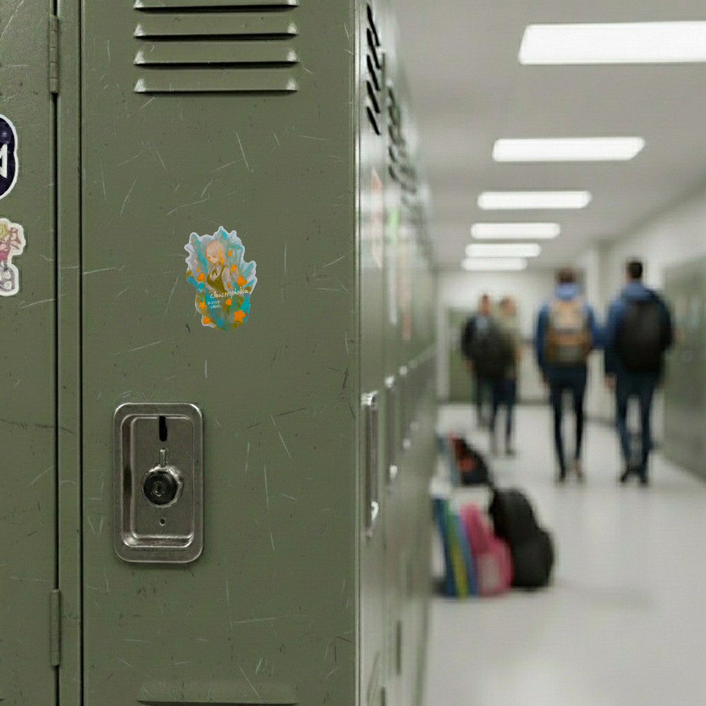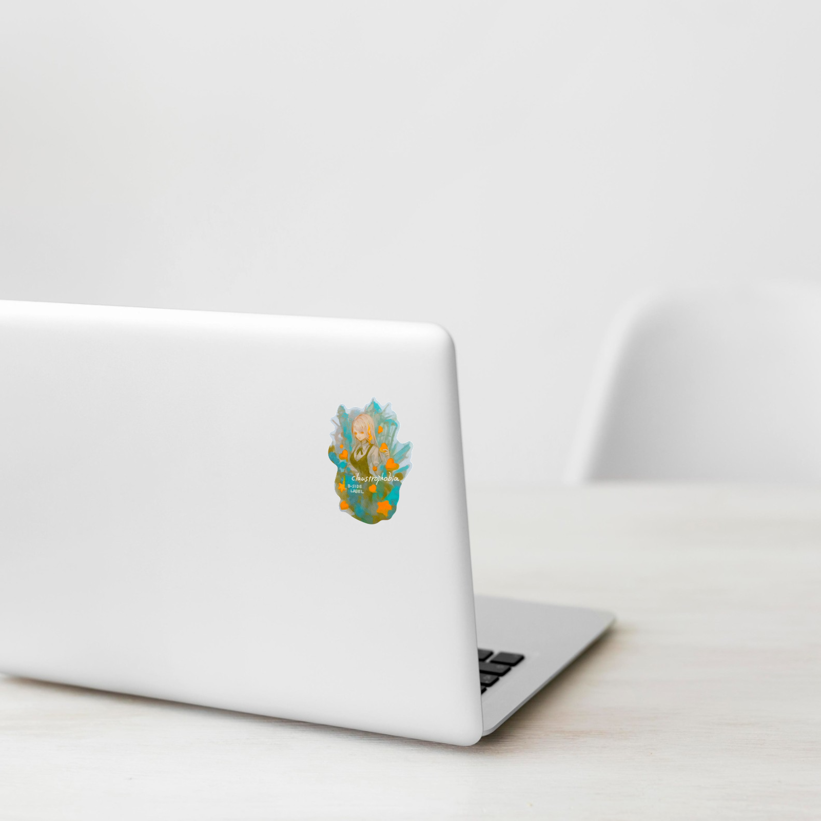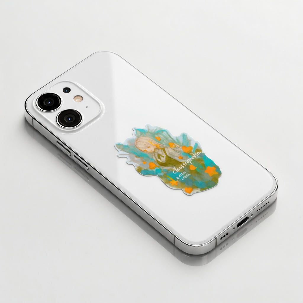 This dreamlike B-Side Label sticker titled “Claustrophobia” captures a quiet, surreal tension — a lone figure surrounded by bursts of orange hearts against a cool, layered blue-green background. It’s a delicate visual metaphor for feeling confined yet alive with emotion and thought.