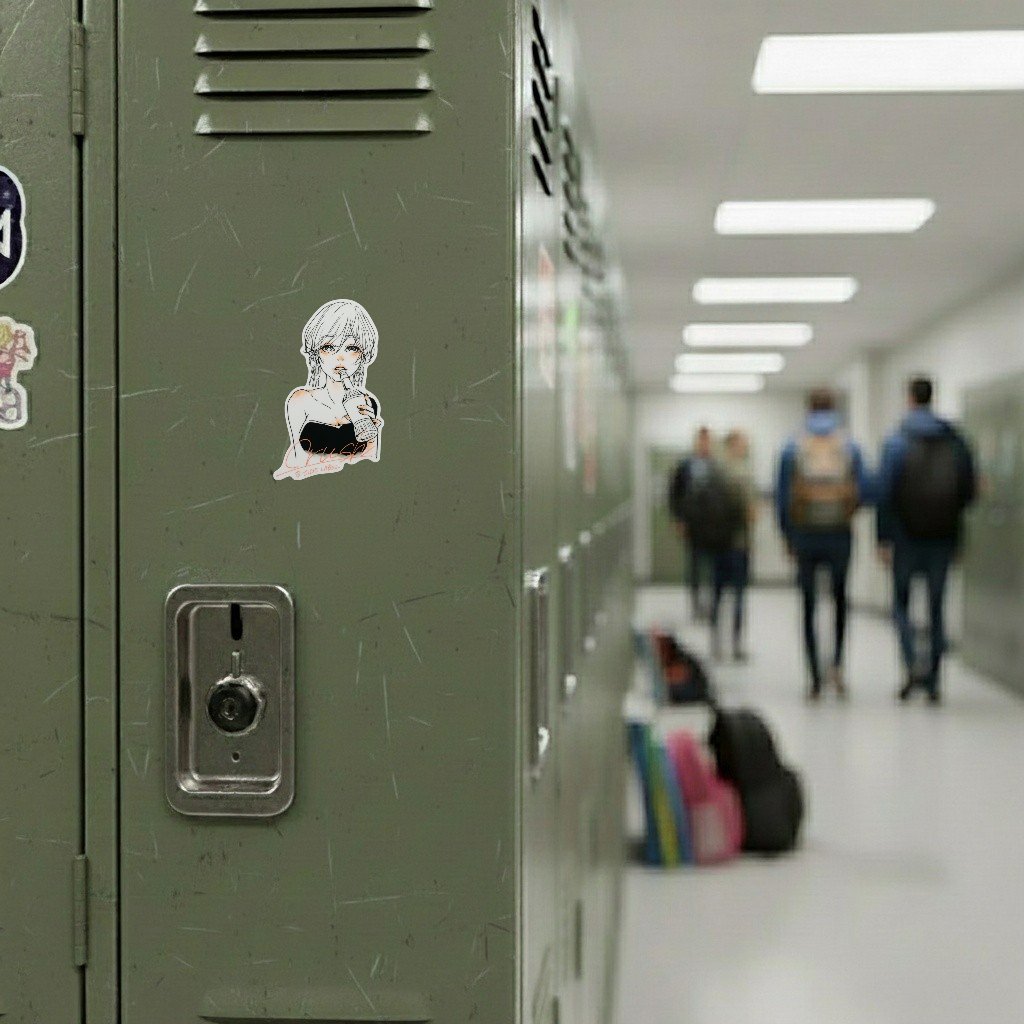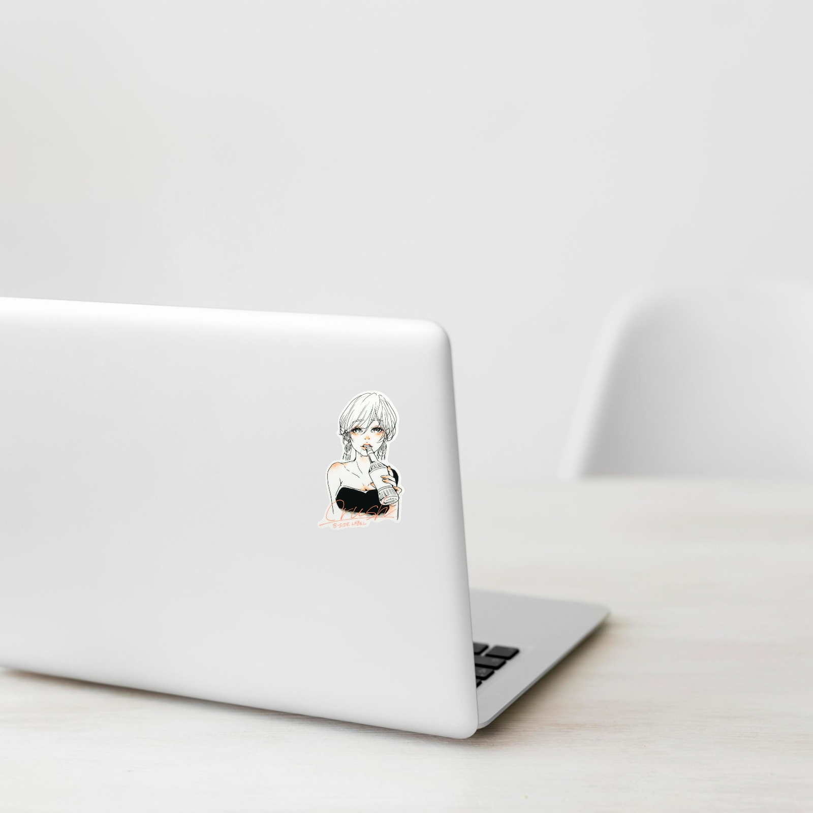 This striking B-Side Label sticker captures a stylish, emotional moment — a girl in a sleek black dress holding a bottle, her gaze soft yet magnetic. The word “Crush” written in fluid script adds a touch of bittersweet romance, perfectly balancing confidence and vulnerability.