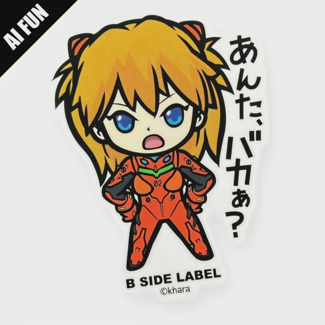 Fiery attitude, fierce stance, and full pilot suit—this chibi-style Asuka sticker captures the spirit of the iconic Evangelion heroine in perfect B-Side Label fashion. Her bold pose and sharp expression say it all: “Anta baka?!” (“What are you, stupid?!”).