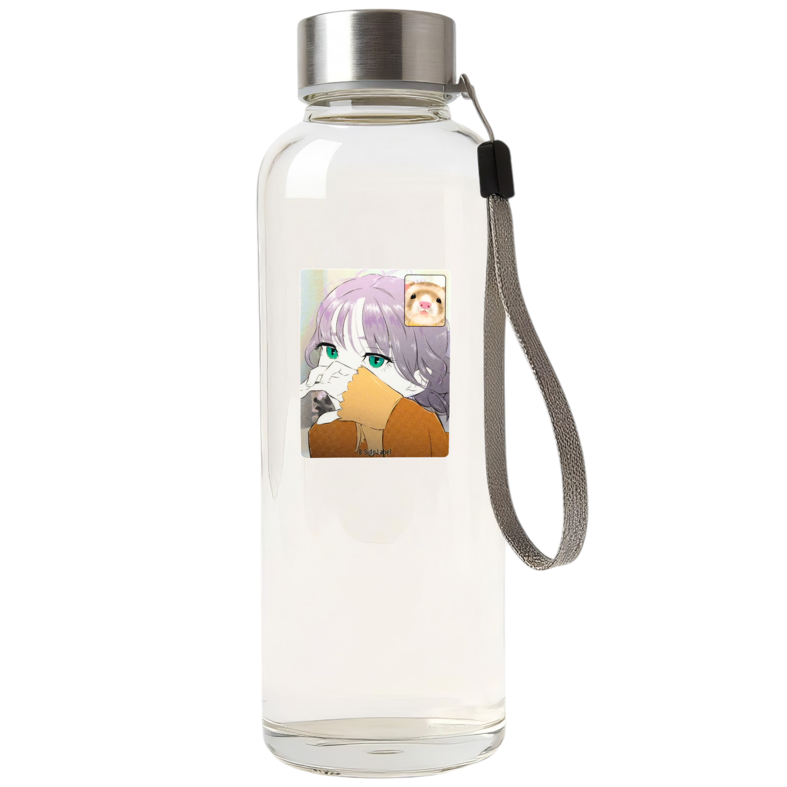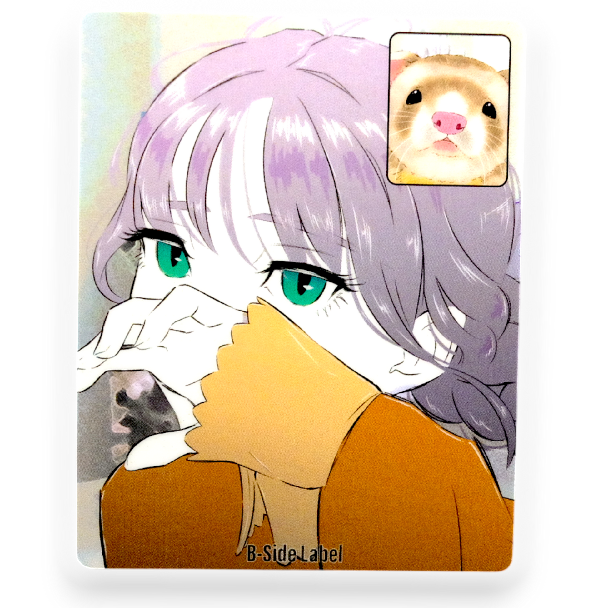This soft and expressive design features a thoughtful anime girl with striking teal eyes and flowing lavender hair, paired with a small portrait of a curious ferret in the corner. The contrasting emotions between the serene girl and the playful animal create a unique collectible piece.