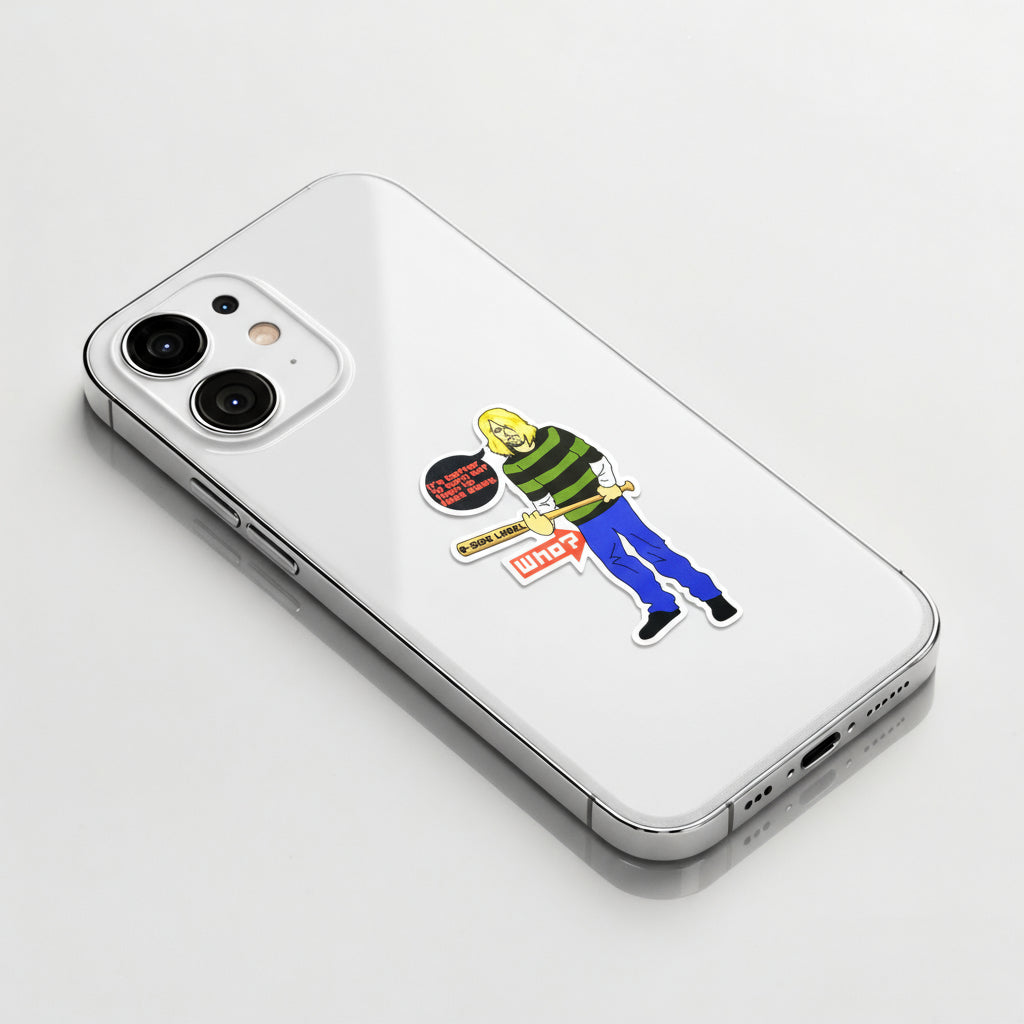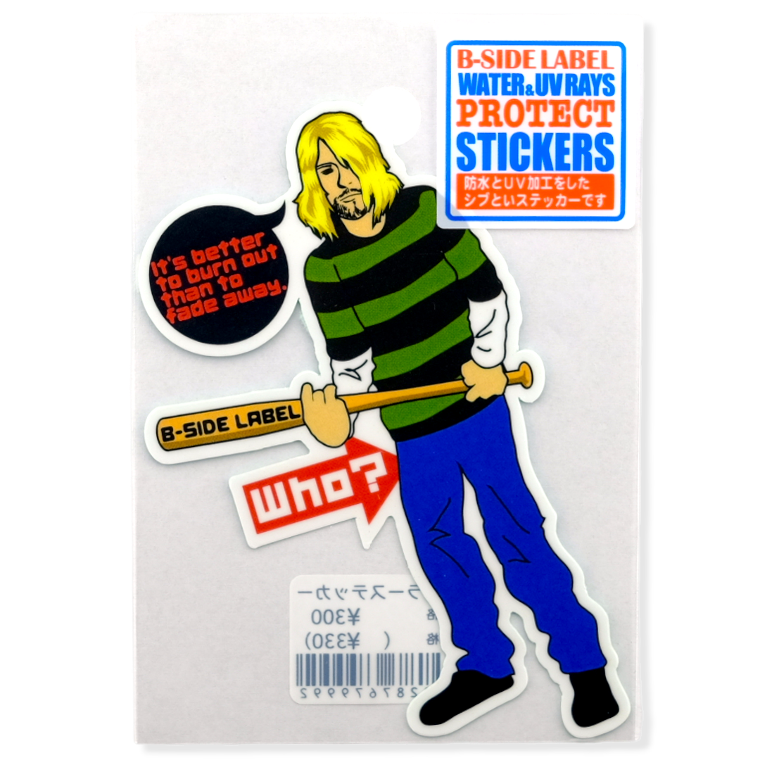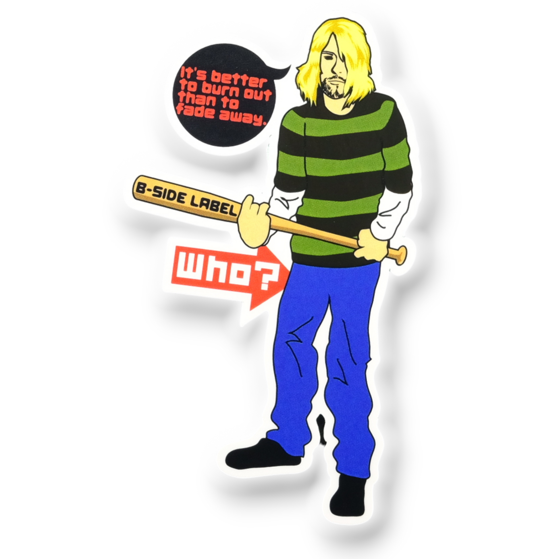 This cheeky B-Side Label sticker channels rock-and-roll attitude with a playful twist. Featuring a oddly familiar grunge-style character holding a bat that reads “B-SIDE LABEL,” he quotes the immortal line “It’s better to burn out than to fade away” — only to be met with the deadpan response: “Who?”