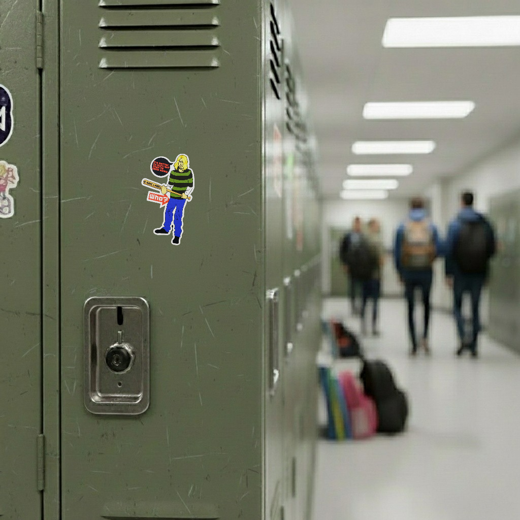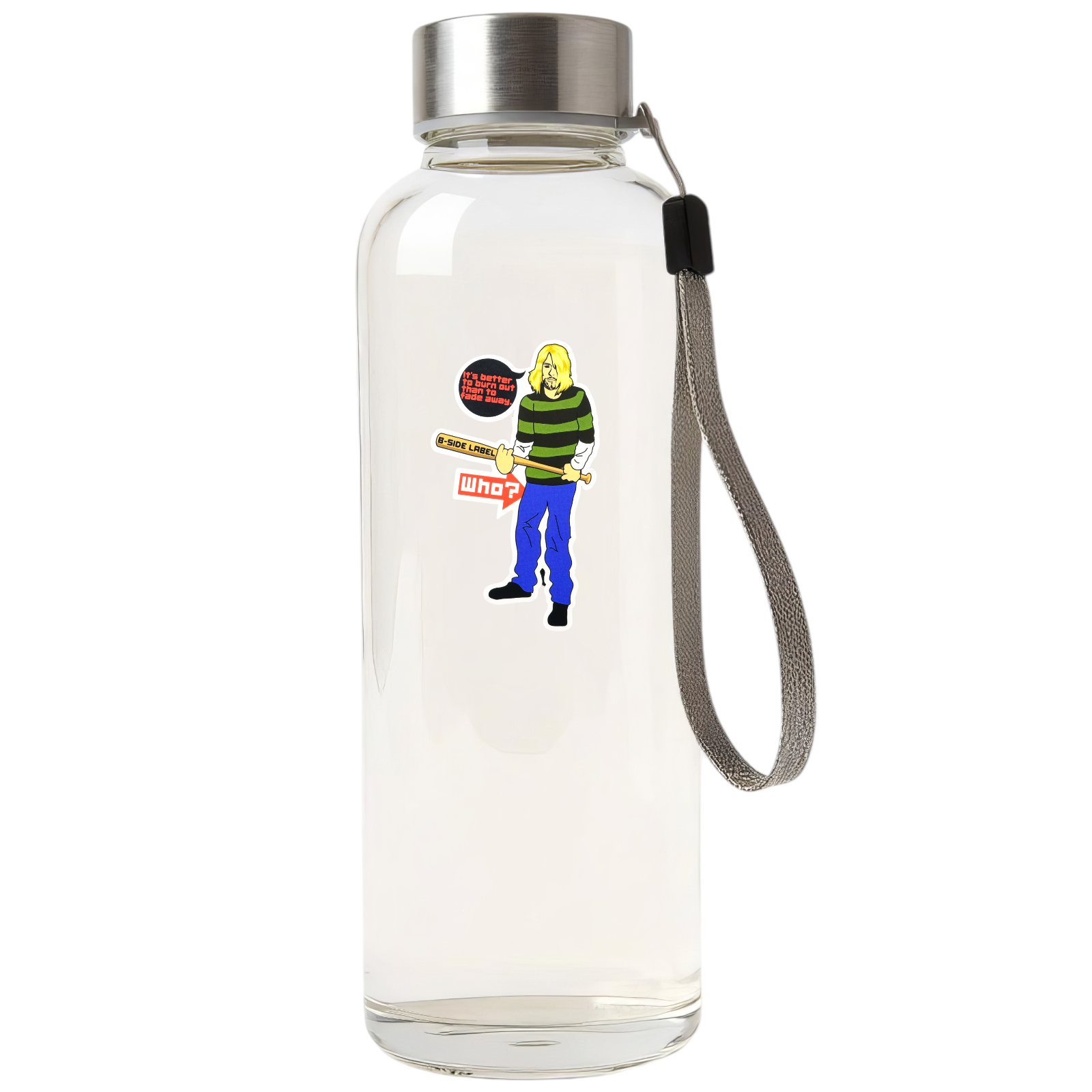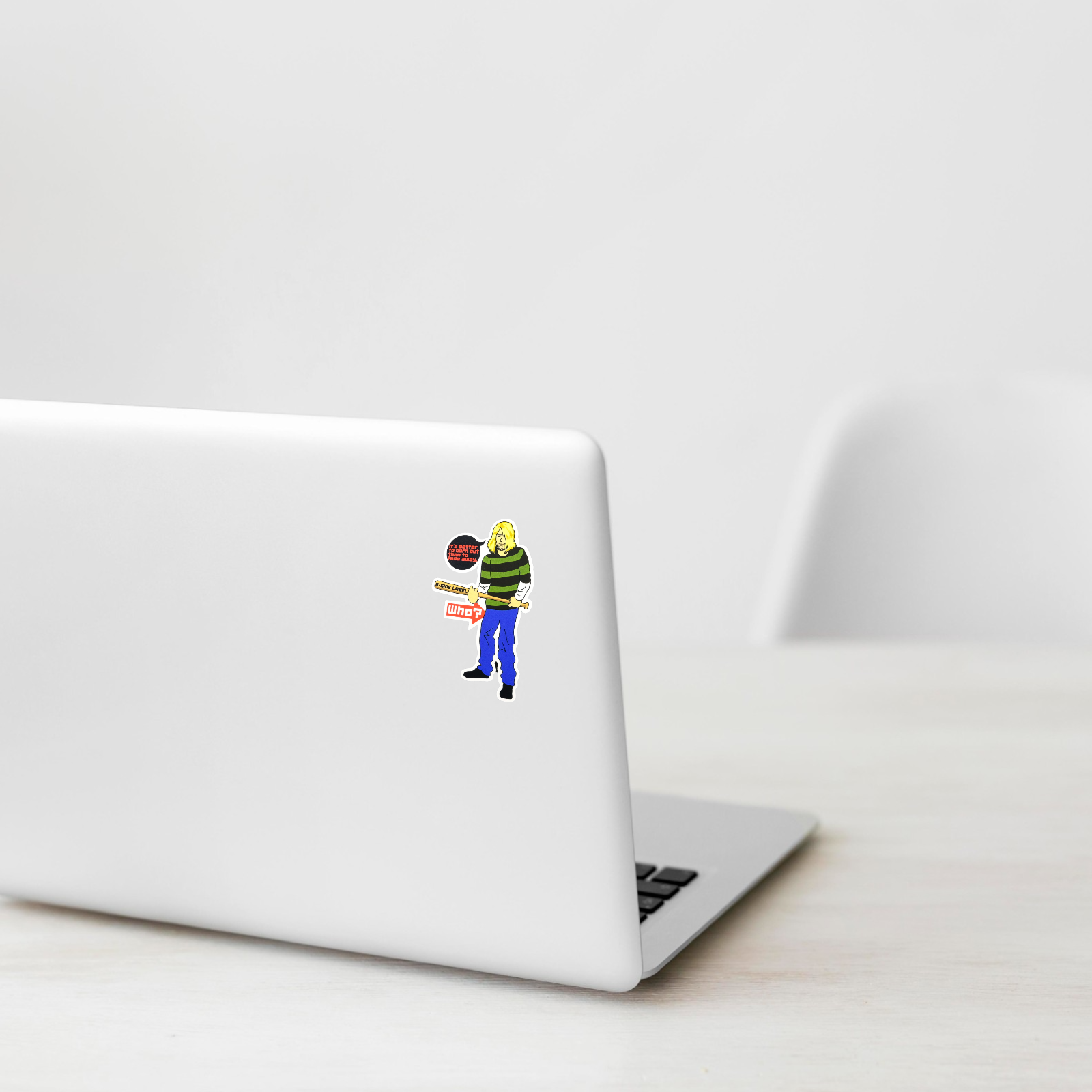 This cheeky B-Side Label sticker channels rock-and-roll attitude with a playful twist. Featuring a oddly familiar grunge-style character holding a bat that reads “B-SIDE LABEL,” he quotes the immortal line “It’s better to burn out than to fade away” — only to be met with the deadpan response: “Who?”