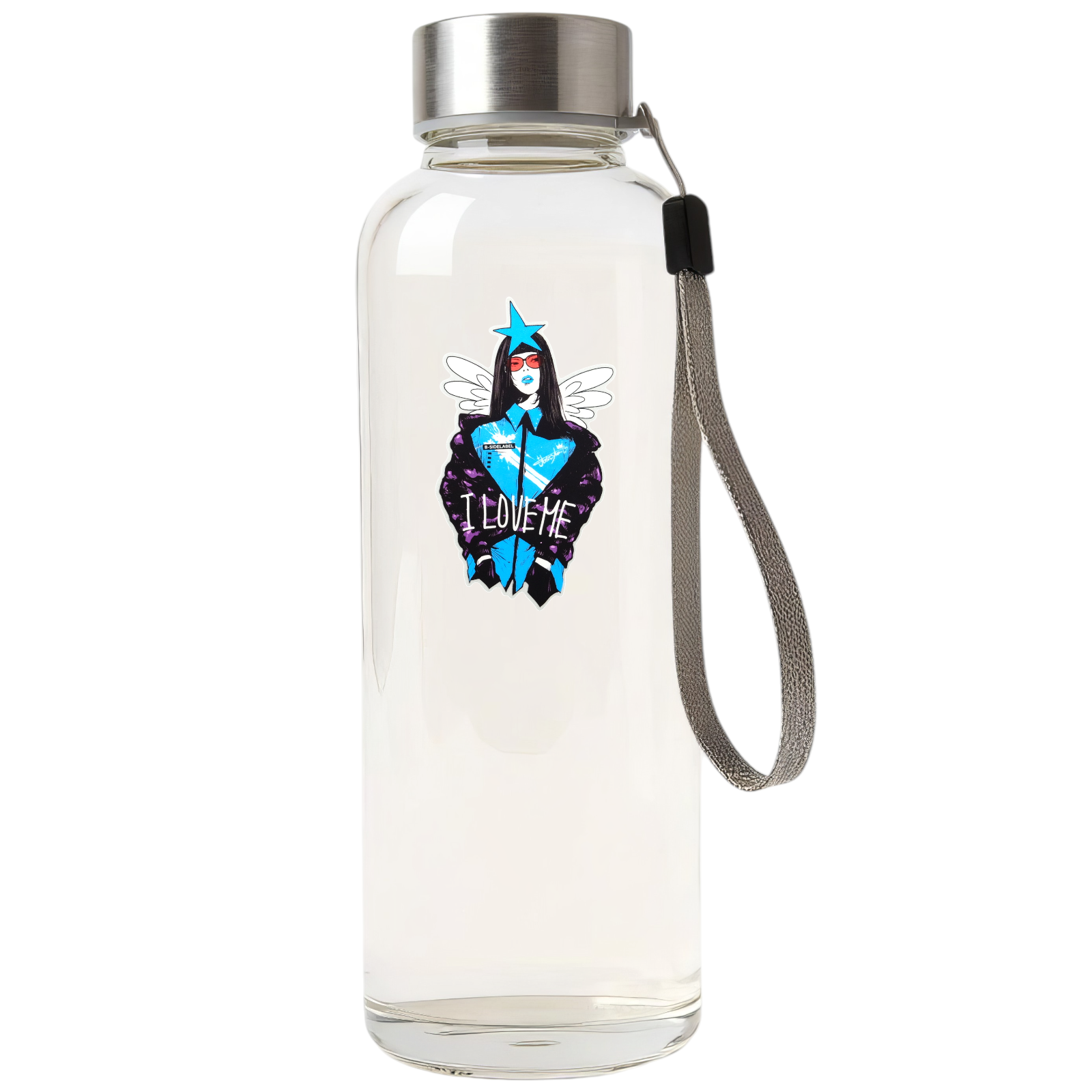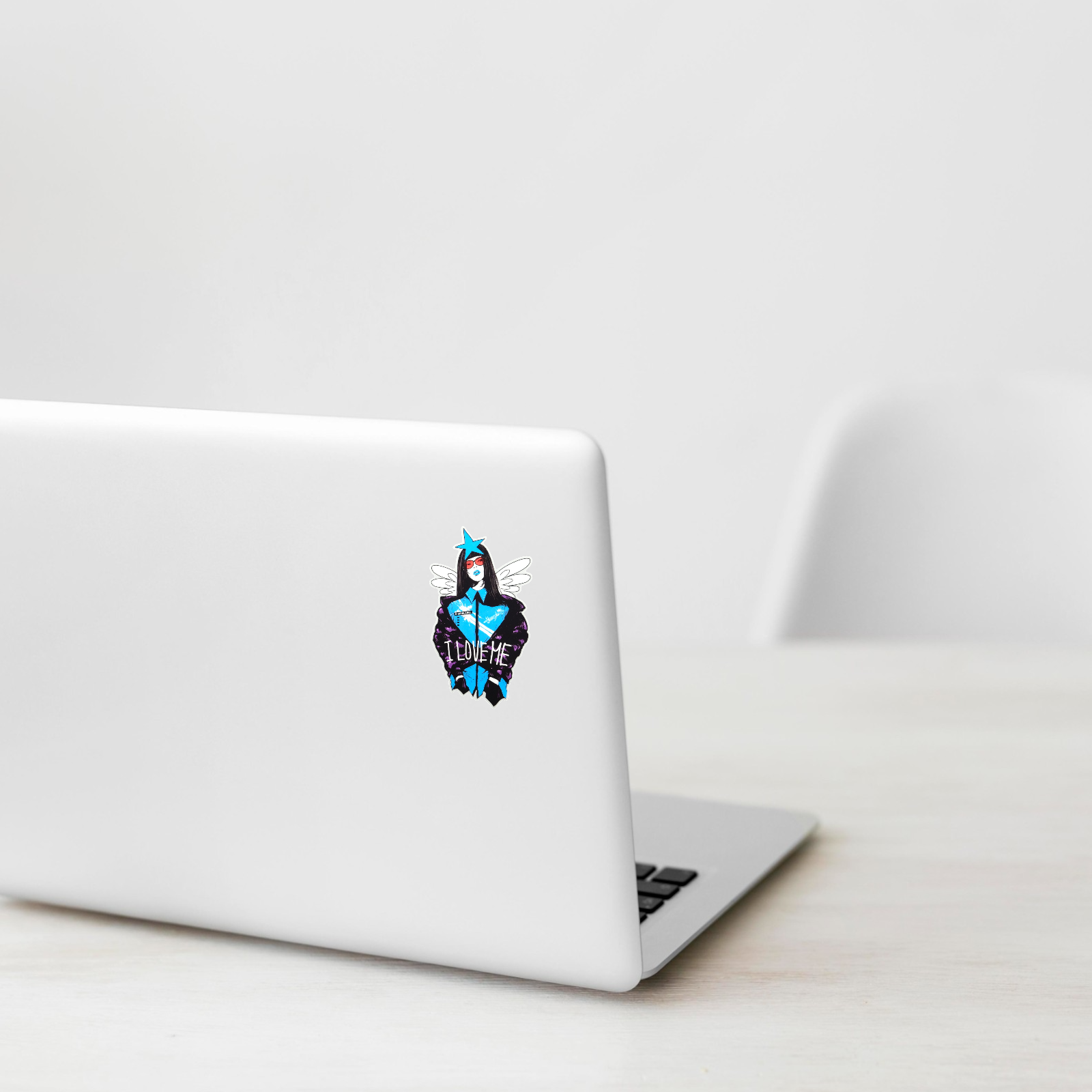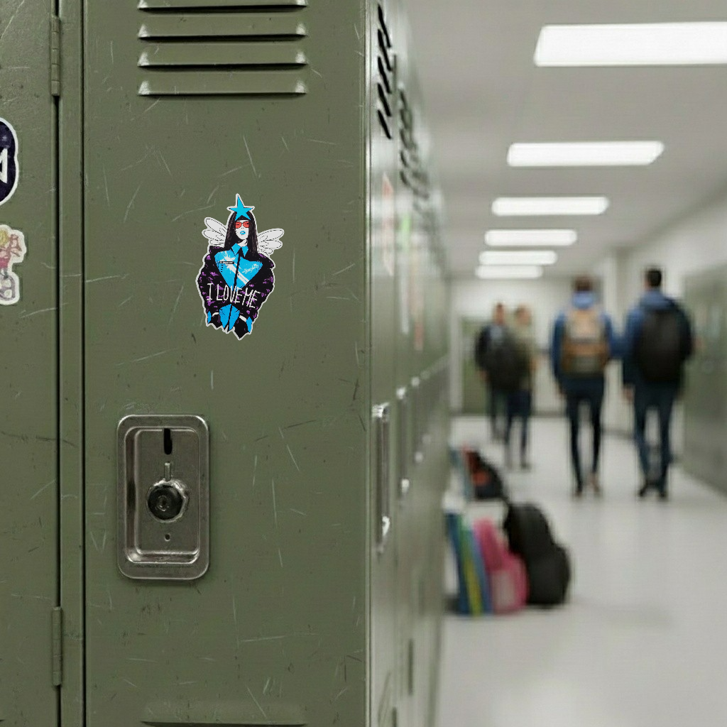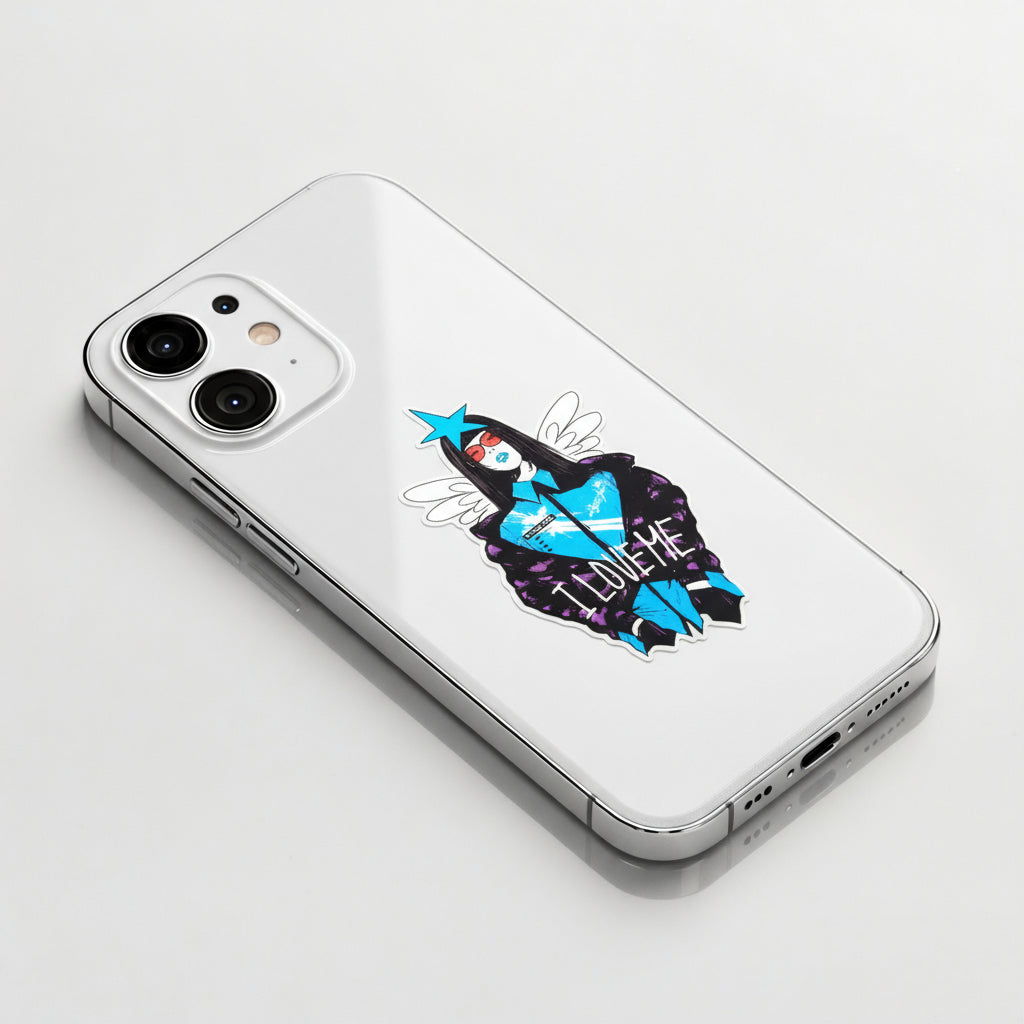 This bold B-Side Label sticker radiates unapologetic confidence. Featuring a stylish woman with long hair, red shades, and a vibrant blue star crown, she stands like a pop icon in command of her own world. The phrase “I LOVE ME” drives home the message — self-respect, self-love, and a dash of rebellion.