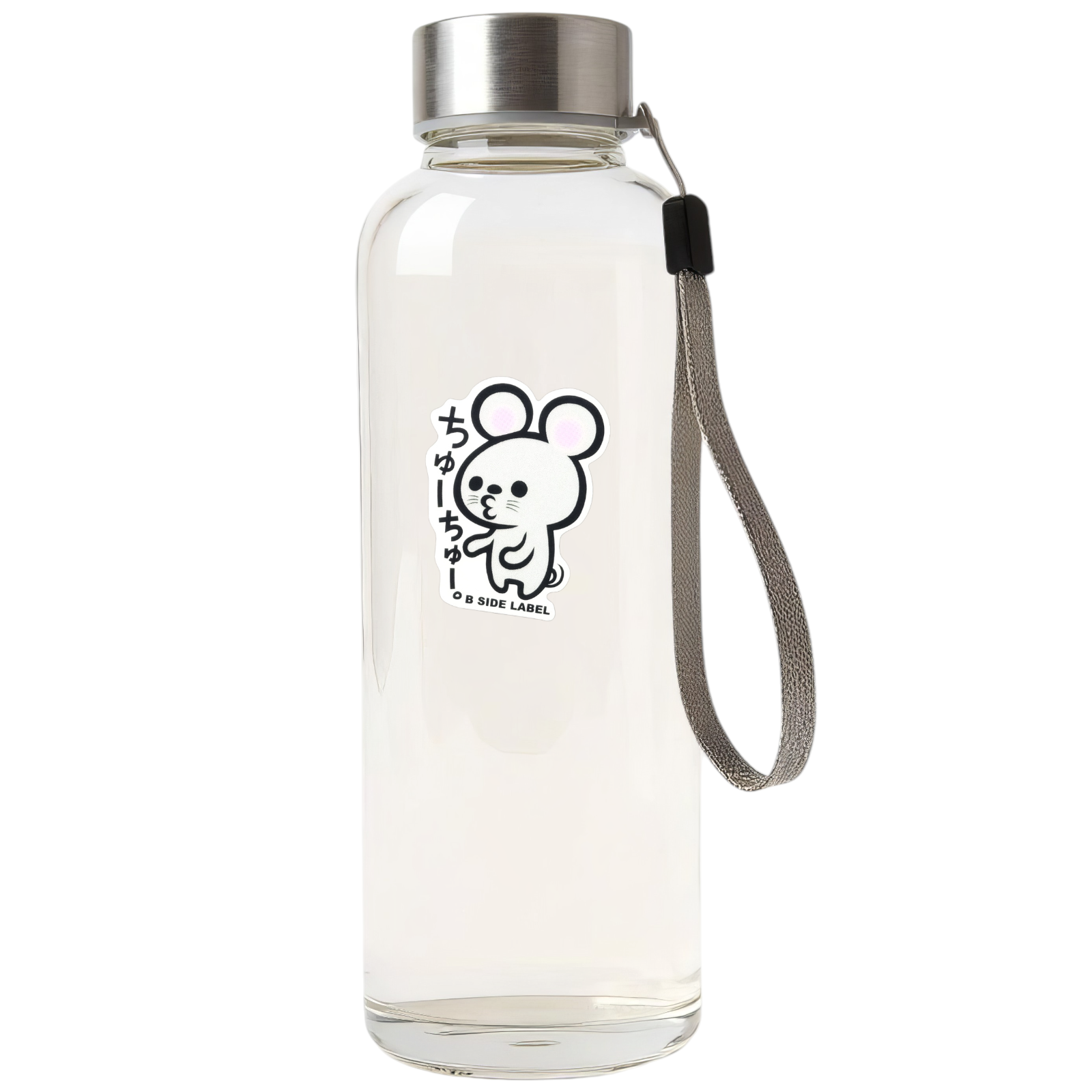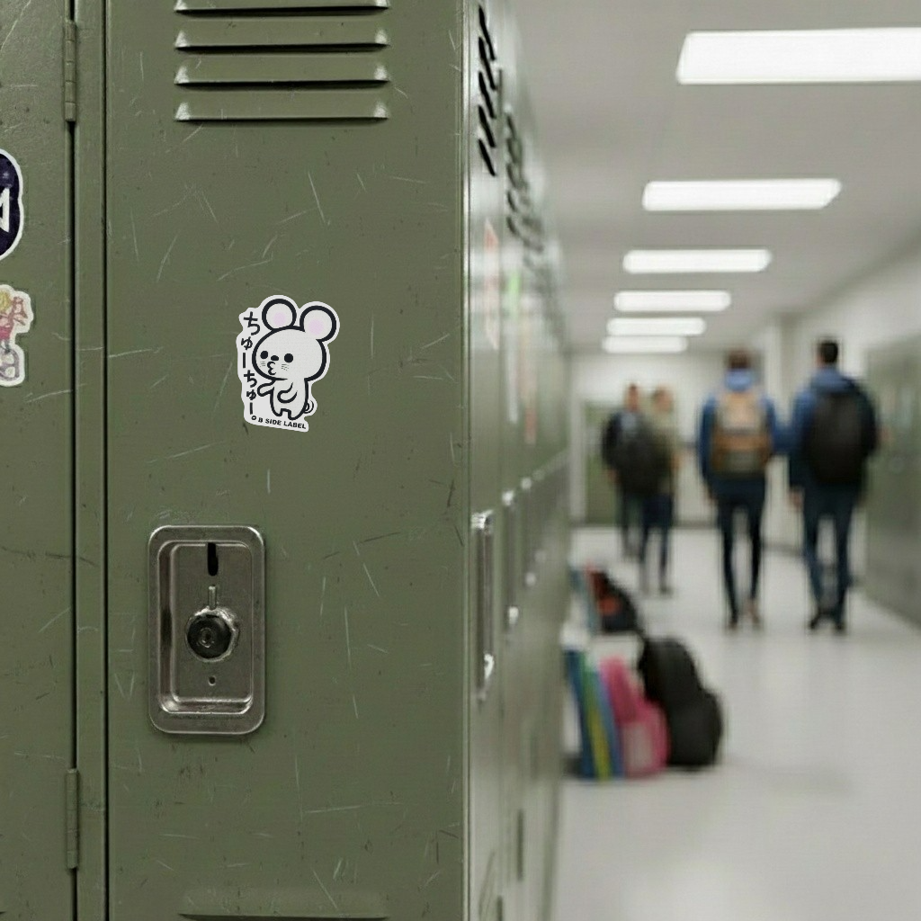 Adorably simple and irresistibly charming — this design features a round, wide-eyed mouse with the Japanese text “ちゅーちゅー” (chū chū – kissy sound). Its bold black outline and playful expression make it a perfect touch of kawaii fun.