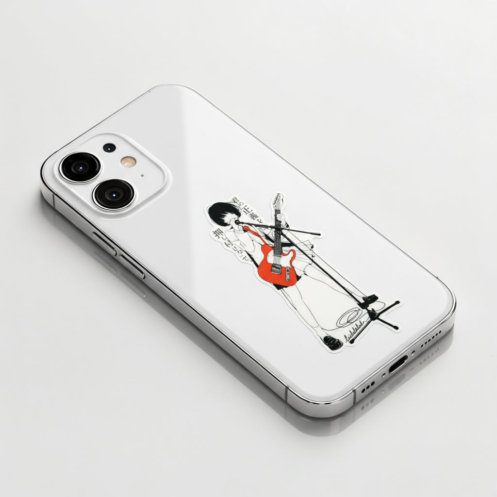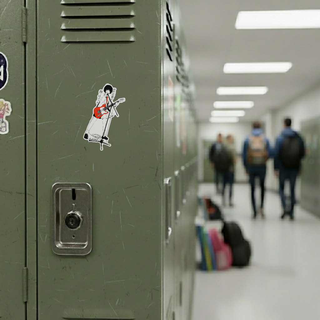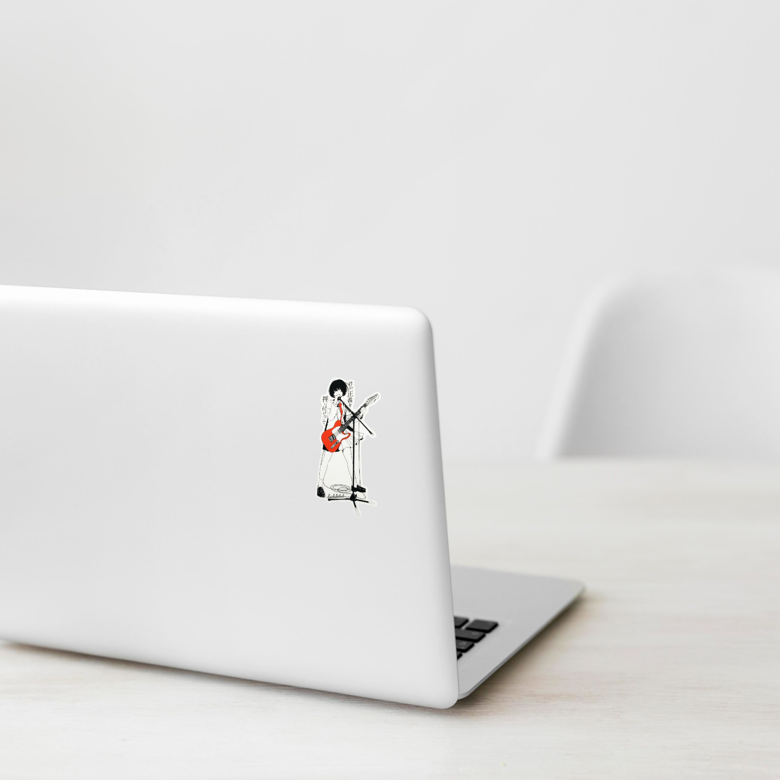 This bold B-Side Label sticker features a striking illustration of a girl rocking out on stage, microphone in hand and electric guitar blazing in red. The minimalist black-and-white contrast with a single burst of color captures the raw emotion of youth and rebellion.