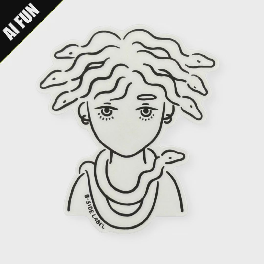 Cool, calm, and a little bit dangerous — this minimalist B-Side Label sticker gives Medusa a modern twist. With snakes for hair and a relaxed, unbothered gaze, it’s a clean monochrome design that blends myth and street style.