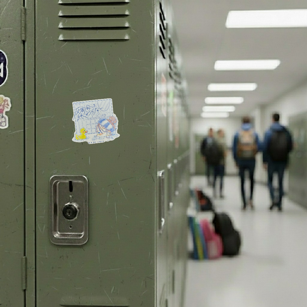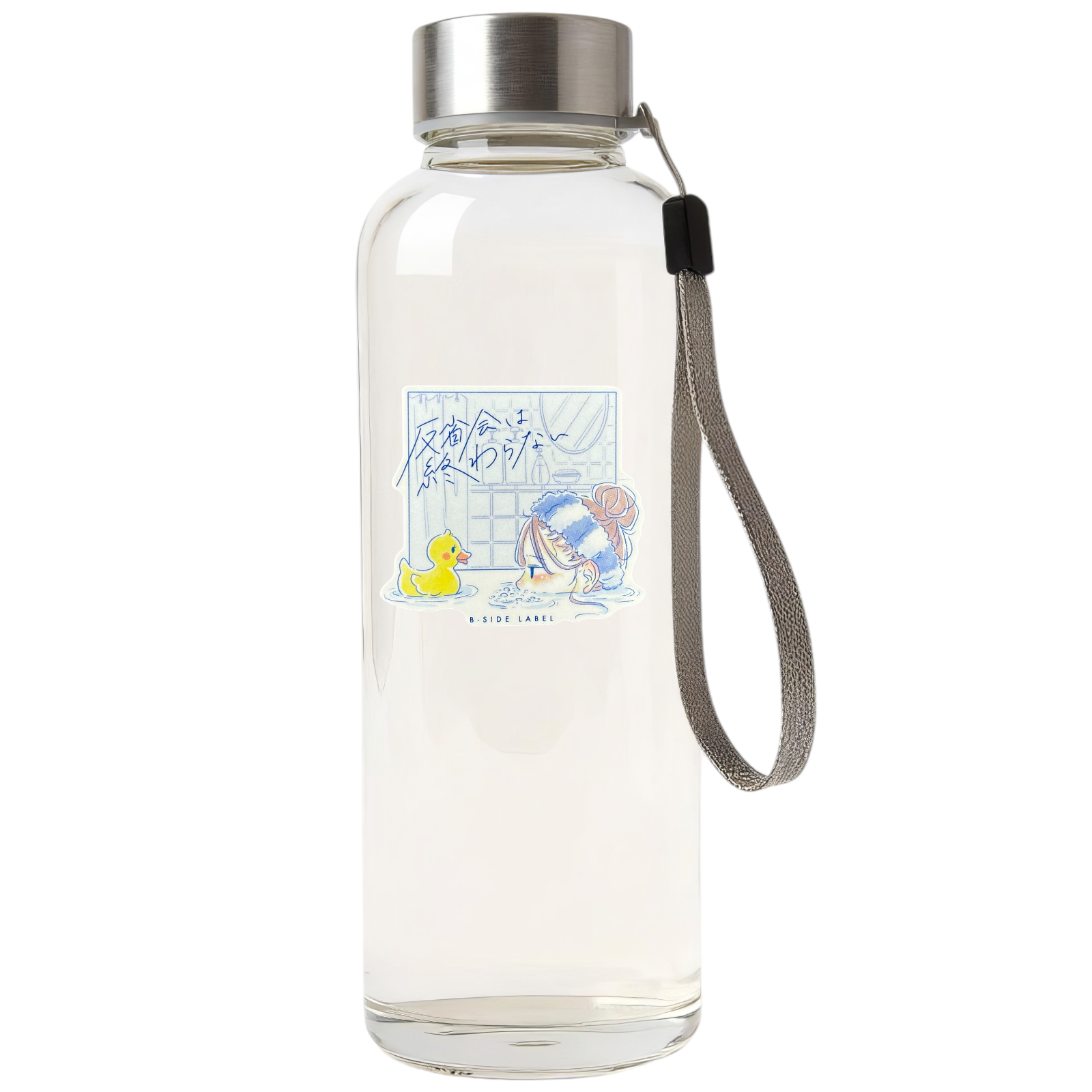 This tranquil “Late-Night Reflection” sticker from B-Side Label captures a quiet moment in the bath — a girl soaking peacefully as a rubber duck keeps her company. The soft pastel tones and handwritten Japanese text (「反省会は終わらない」 meaning “The reflection meeting never ends”) create a mood of calm introspection with a touch of humor.