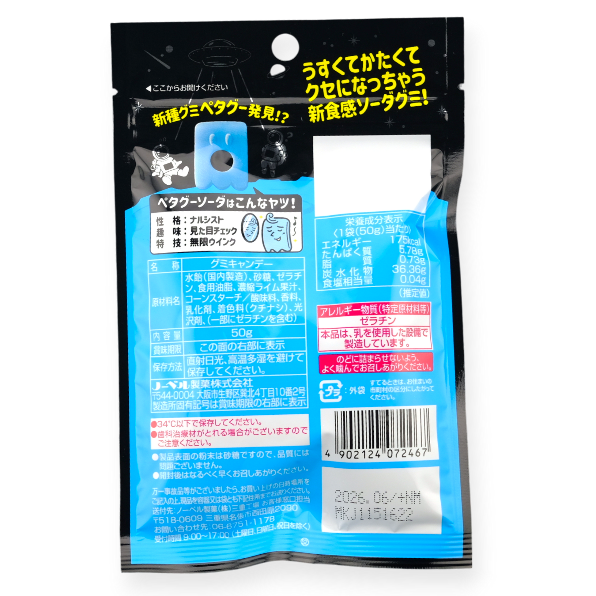 A uniquely shaped hard gummy from Nobel, designed to be thin, firm, and satisfyingly tough. This soda-flavored Petaguu Gummy has a crisp bite and a fun, quirky shape that stands out from typical gummies.