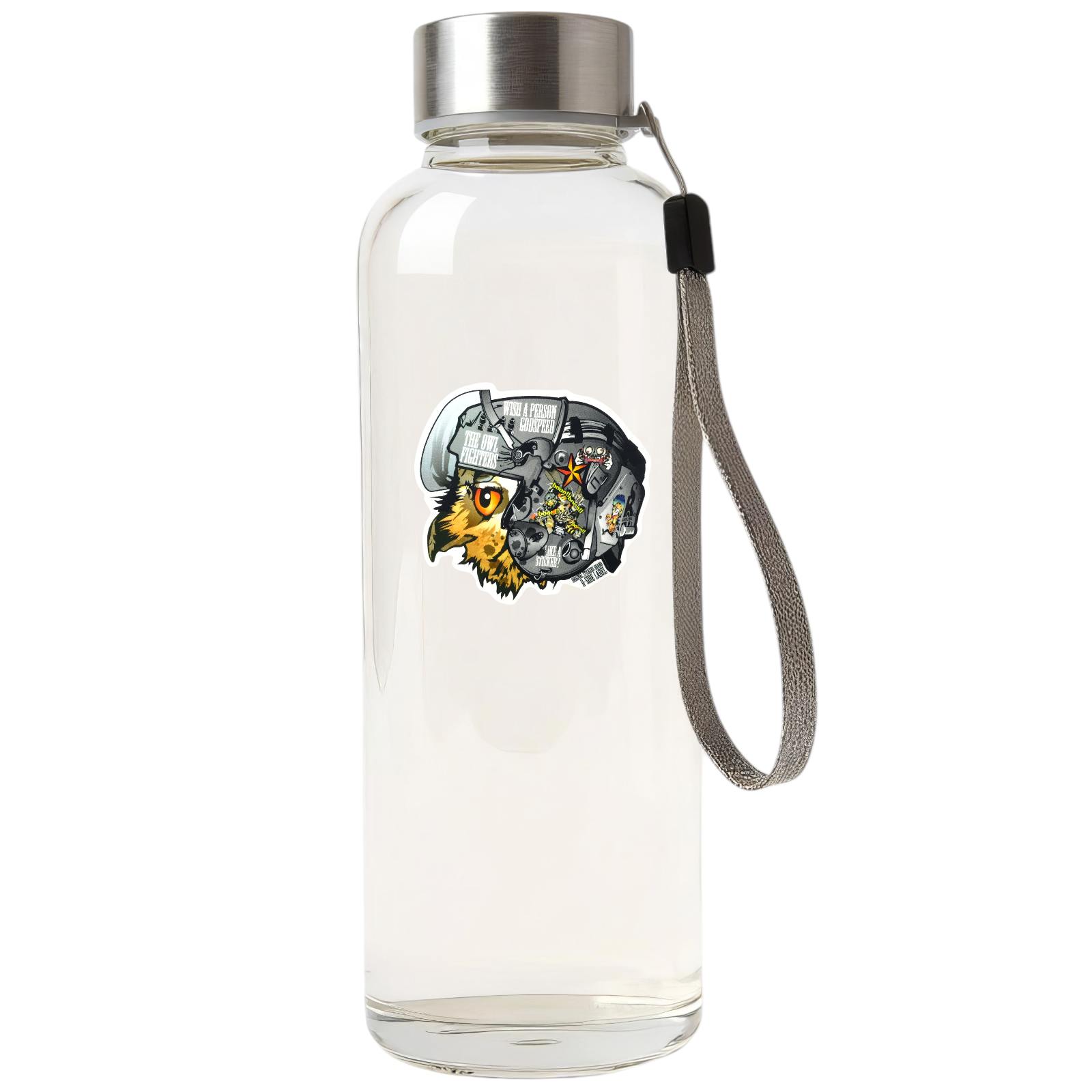 A fierce owl peers through the visor of a detailed fighter helmet, covered in tiny decals and bold lettering. This design mixes sharp-eyed animal energy with gritty military style, making it a striking standout in any collection.