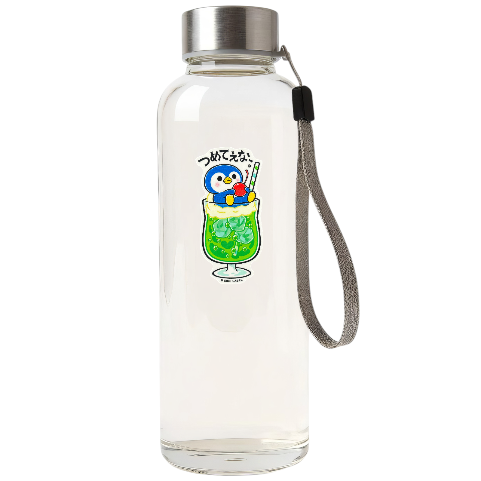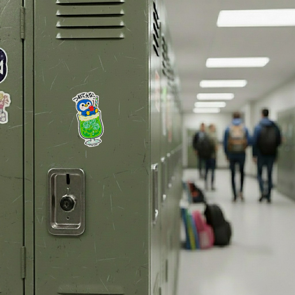 Cool off with this adorable penguin soaking in a glass of Japan’s famous melon cream soda — cherry on top, of course. The Japanese text reads “Tsumete e na~” (“It’s cold!”), perfectly capturing that chill, refreshing summer vibe.
