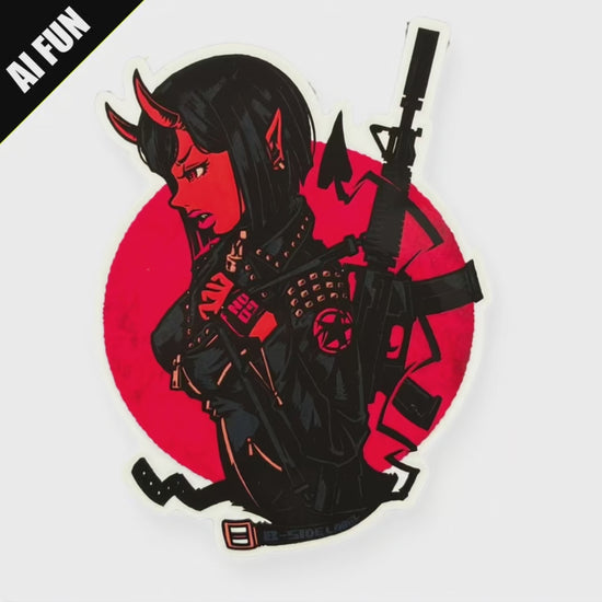 Bold, dangerous, and impossible to ignore—this striking sticker features a devil-horned girl armed and battle-ready against a blood-red circle backdrop. The sharp lines and gritty style channel pure rebellion, making it one of B-Side Label’s most electrifying designs.