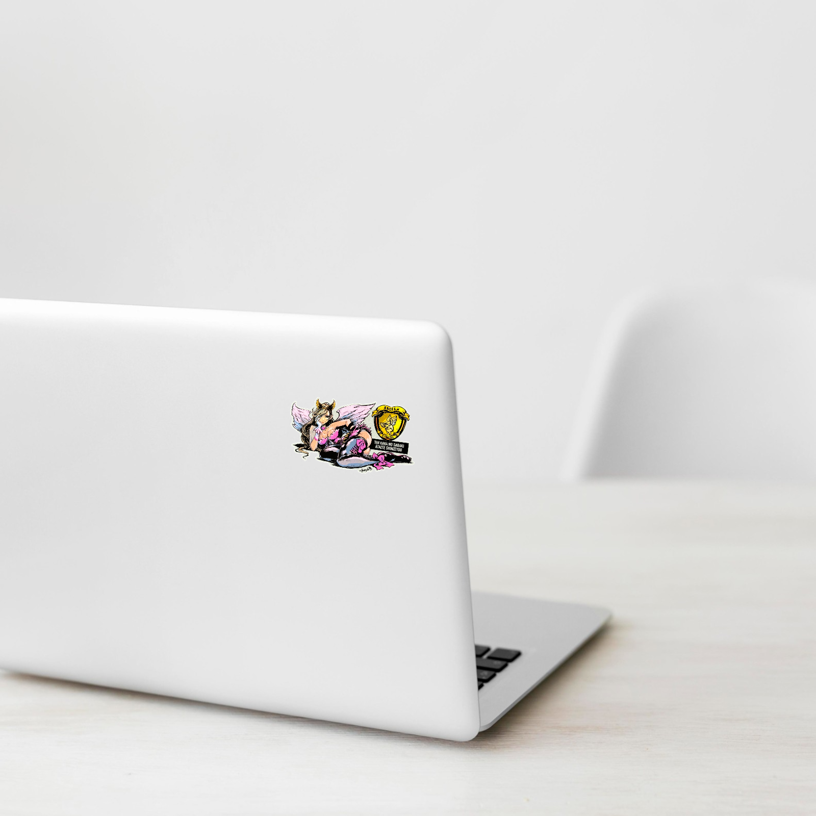 Striking a pose somewhere between divine and dangerous, this B-Side Label “Angel” sticker radiates bold confidence and allure. With golden horns, soft pink wings, and daring attitude, she’s equal parts heavenly and rebellious. The text “TEN KARA NO SABAKI ATAETE SHINZEYOU” translates to “I shall deliver judgment from the heavens.”