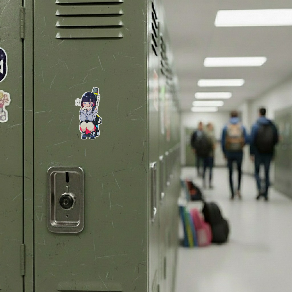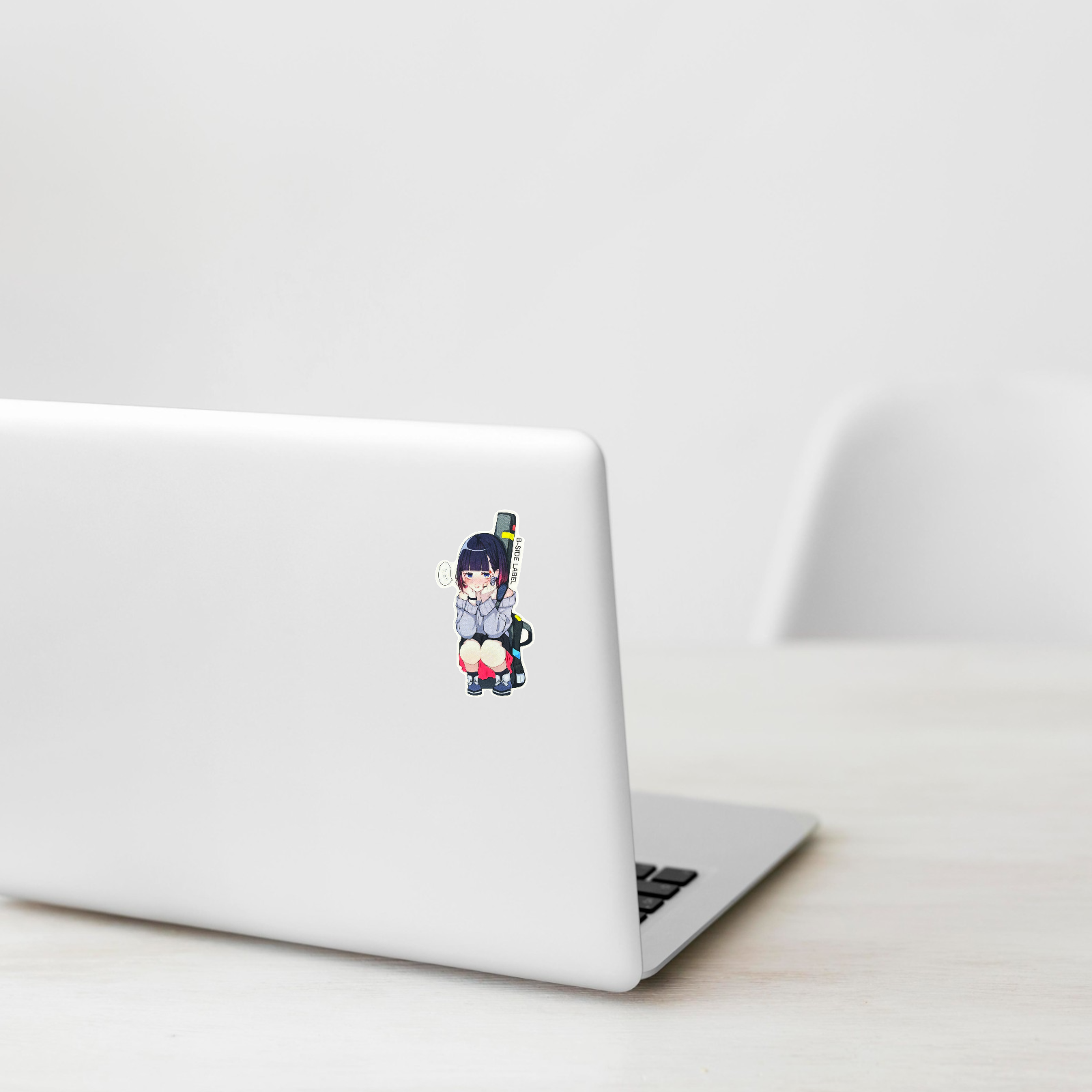 She’s got her guitar case, her oversized sweater, and that adorable pout — the “baka…” says it all. This B-Side Label sticker perfectly captures that classic anime mix of shyness, attitude, and charm.