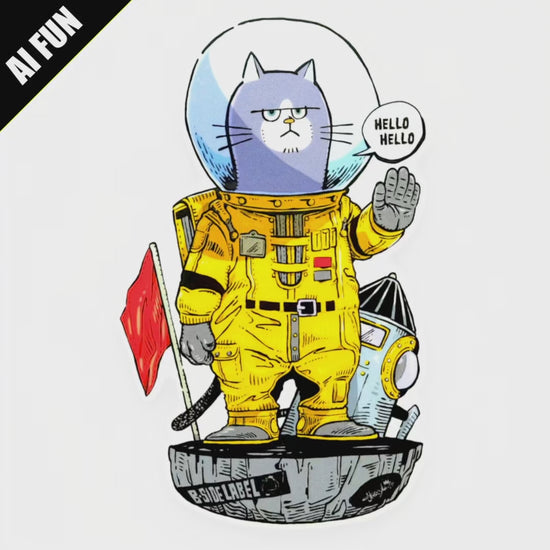 This unbothered feline has made it to the final frontier. Dressed in a yellow space suit and standing proudly on the moon with a flag, this cool cat greets the universe with a casual “Hello Hello.” A fun mix of sci-fi adventure and laid-back kitty charm.