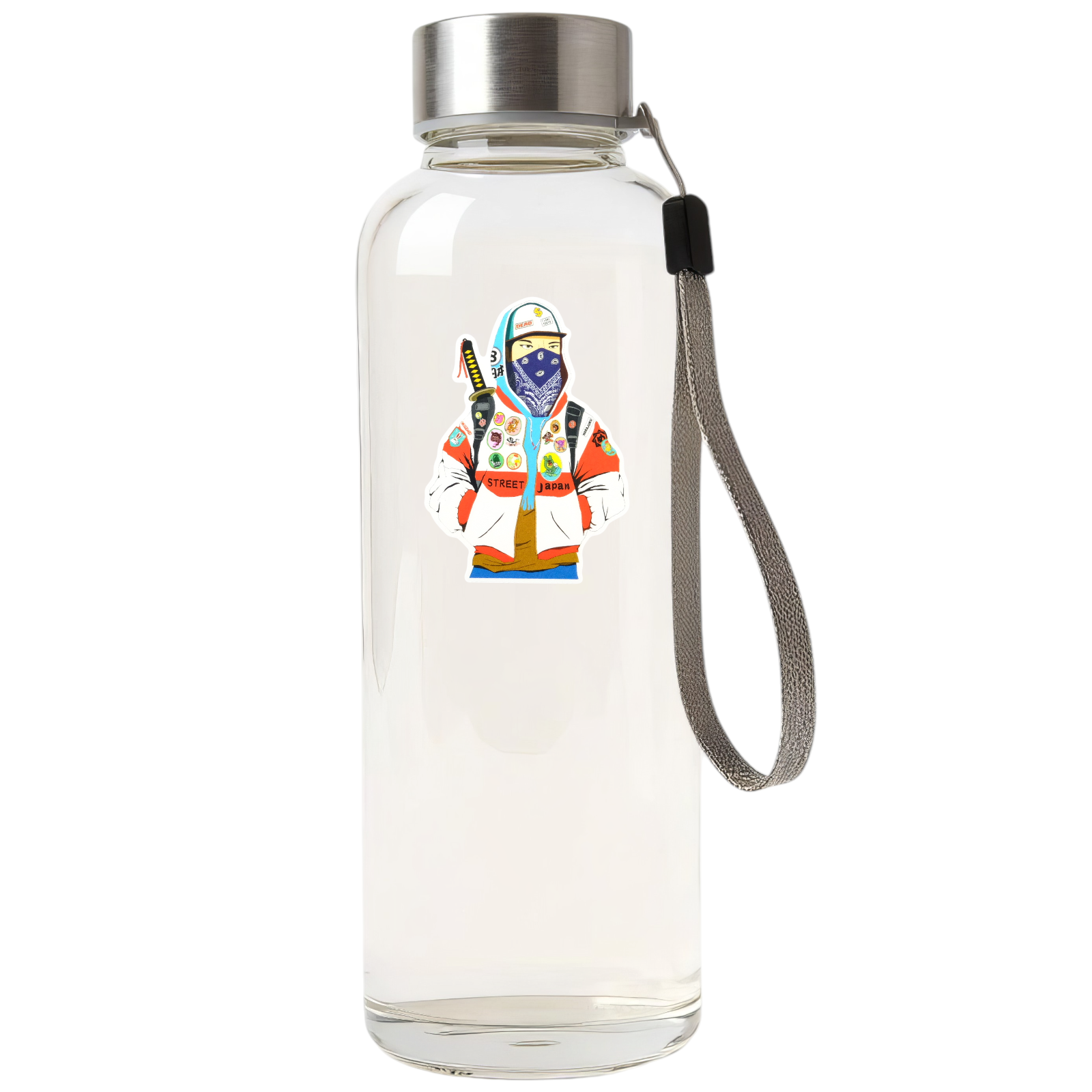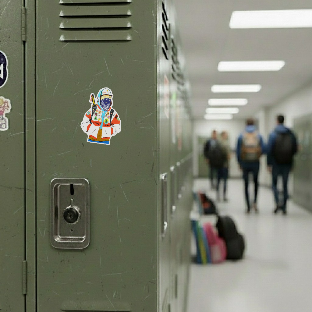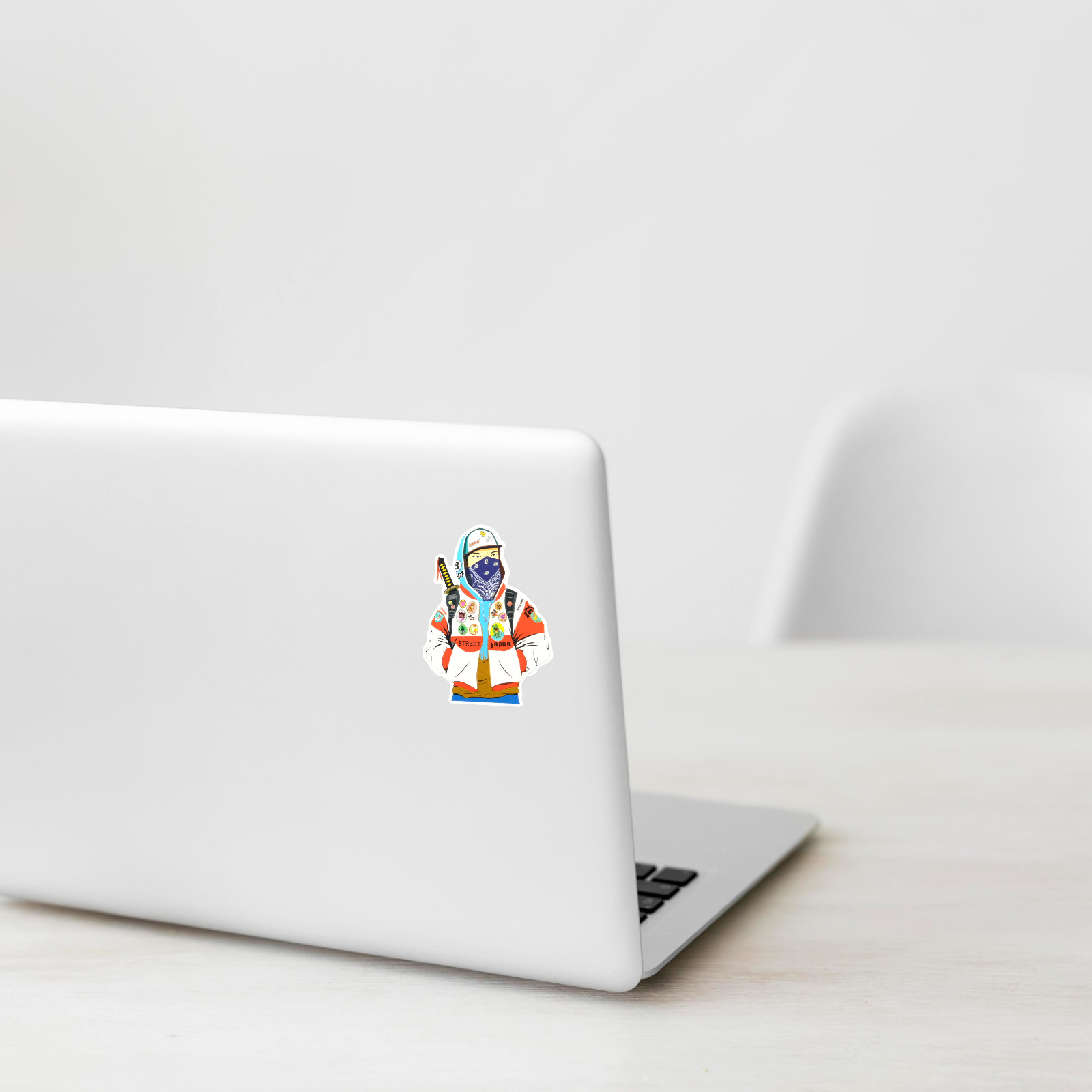 This fierce B-Side Label sticker showcases the red-jacket variant of the iconic Street Japan series. The masked figure exudes urban samurai cool — rocking a bandana, loaded-up pins, and a katana strapped to his back. Every detail is pure Tokyo street energy.