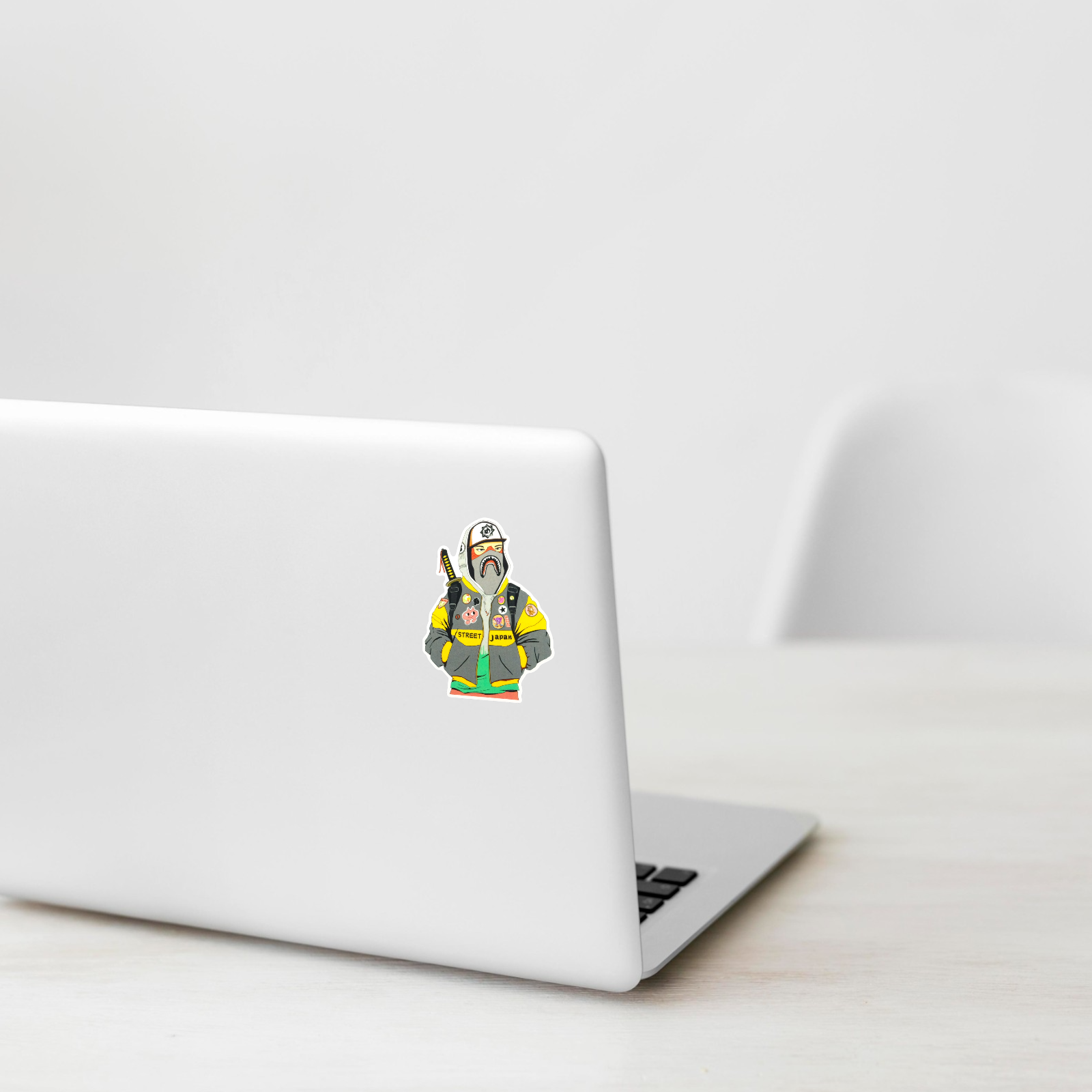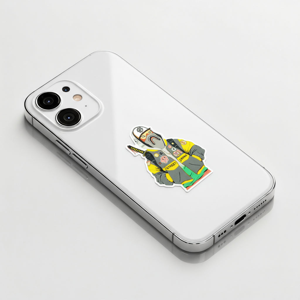 Bold, urban, and undeniably cool — this B-Side Label sticker blends Japanese street fashion with otaku energy. The masked figure rocks a shark-mouth hoodie, loaded with anime-style pins, and carries a katana across his back. Every detail shouts attitude and creativity.