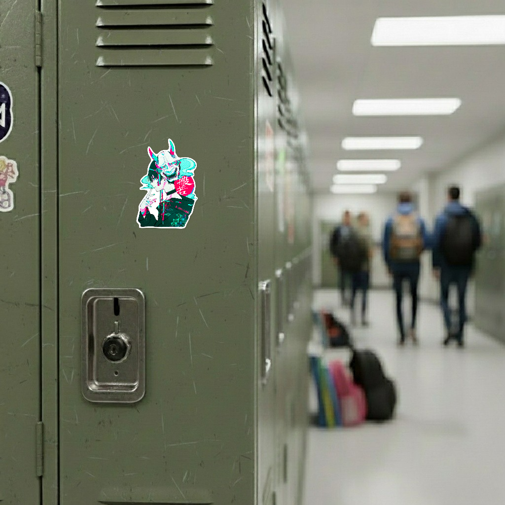 The “Hannya Spirit” sticker from B-Side Label is a striking fusion of Japanese folklore and cyber-pop artistry. The design contrasts the calm, introspective figure with the fierce Hannya mask — a symbol of jealousy and transformation — rendered in bold neon blues, pinks, and reds that give it an electric edge.