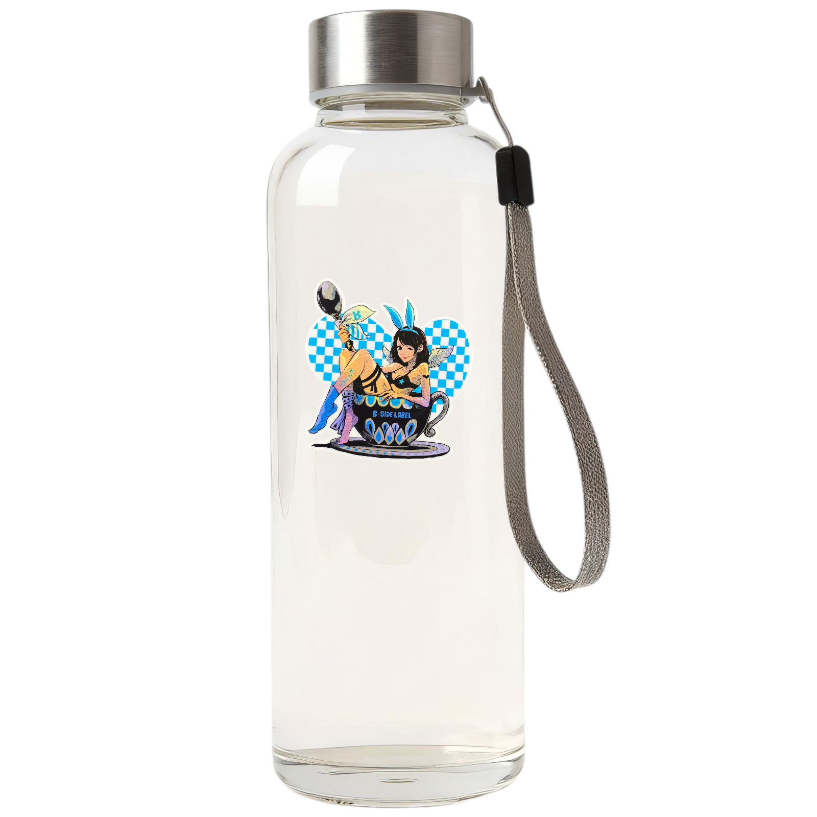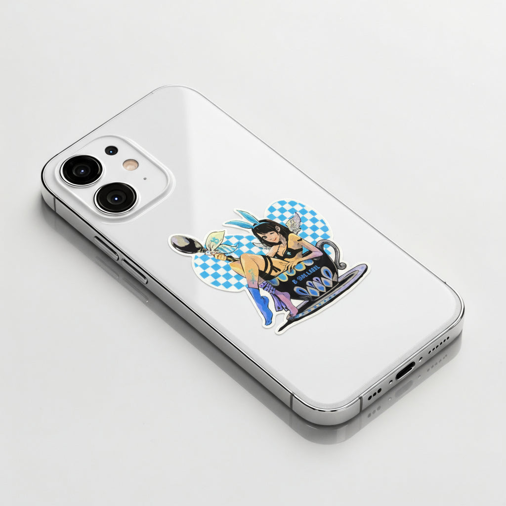 Playful, bold, and a little mischievous — Teacup Angel lounges with a wink that says she knows exactly how charming she is. With tiny wings, sky-blue accents, and a checkered backdrop, this design blends sweetness and confidence in perfect balance.