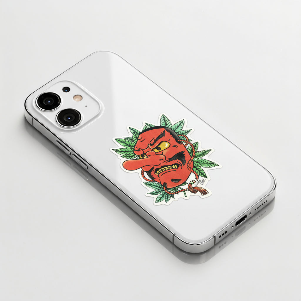 This striking B-Side Label sticker features Japan’s legendary Tengu mask — a fierce red face with a long nose, golden eyes, and sharp fangs surrounded by green leaves. Known in folklore as a mischievous yet powerful spirit of the mountains, the Tengu embodies both danger and wisdom. B-Side Label’s bold color palette and traditional tattoo-style lines make this design a standout fusion of myth and modern art.