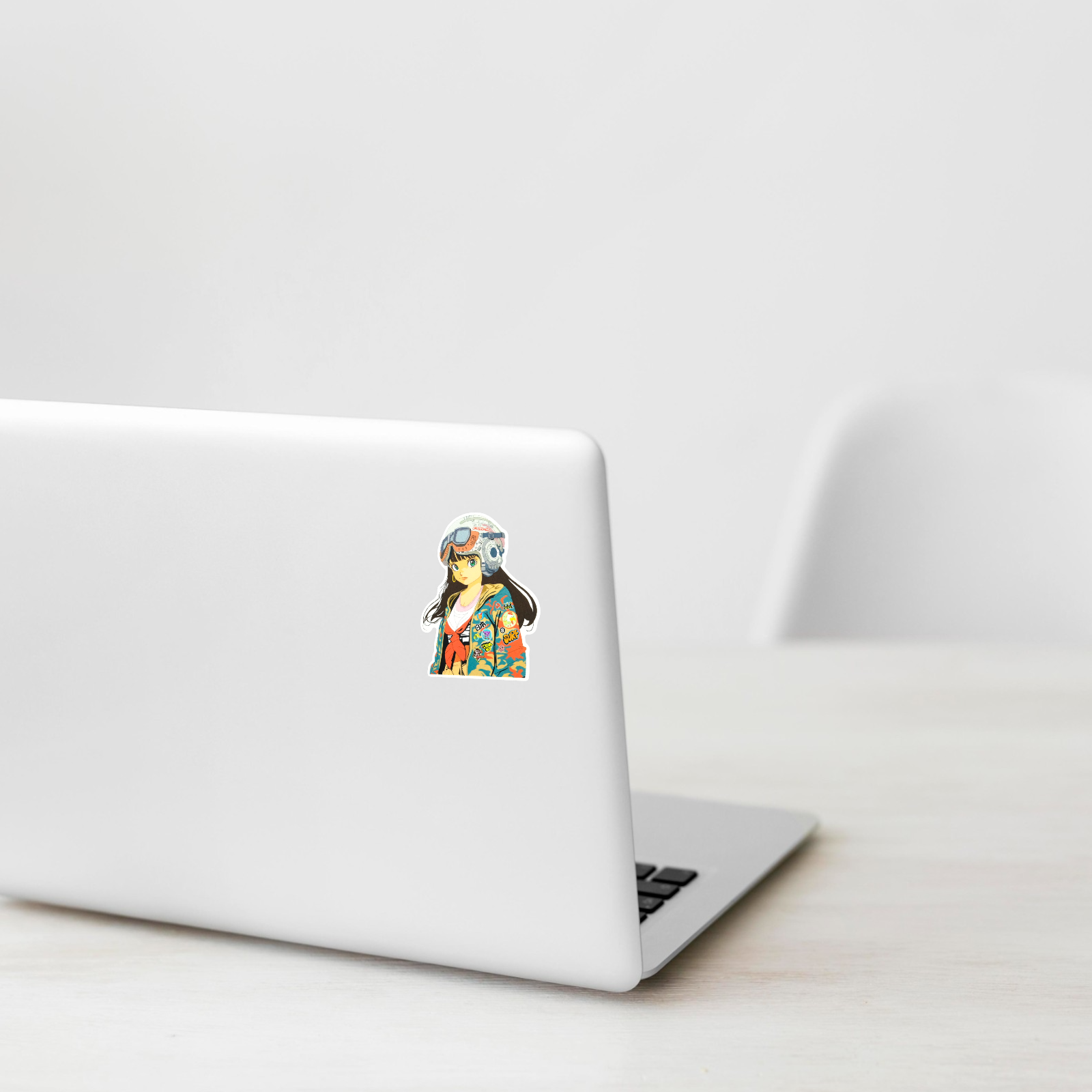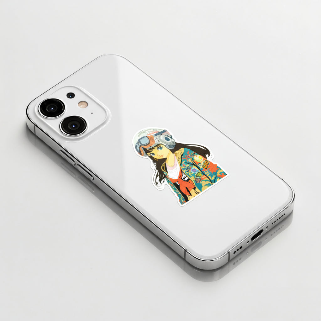 This striking B-Side Label sticker fuses street fashion and sci-fi cool. Featuring a confident girl in a flight helmet and a patched-up camo jacket, it’s a perfect snapshot of Tokyo’s urban edge — mixing pop art, aviation vibes, and otaku chic in one unforgettable design.