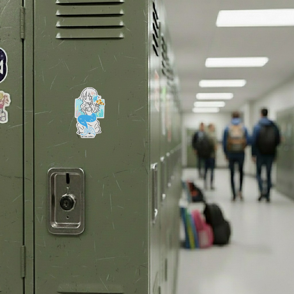 Dive into the deep blue with this enchanting sticker! Featuring a graceful mermaid with flowing hair, a sparkling blue tail, and a playful clownfish companion, it’s a dreamy piece that captures the magic of ocean life. Surrounded by coral and sea stars, she’s the perfect mix of cute and mysterious.