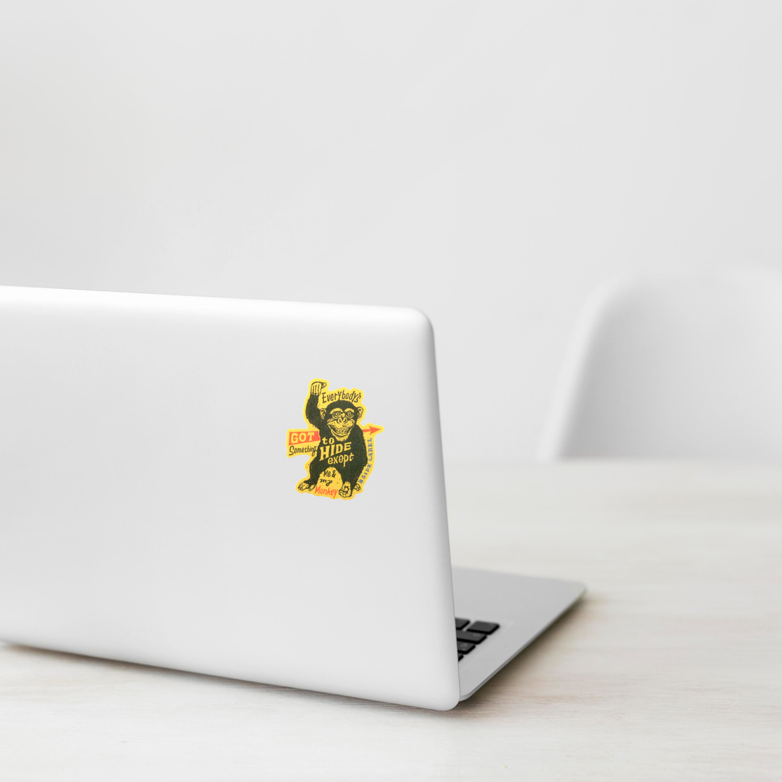 A cheeky callback to vintage rock ‘n’ roll and 1960s counterculture, this “Me & My Monkey” sticker features a grinning chimp proudly declaring, “Everybody’s got something to hide except me and my monkey.” Its retro print style and bold yellow-and-black contrast make it a statement piece with a playful edge.