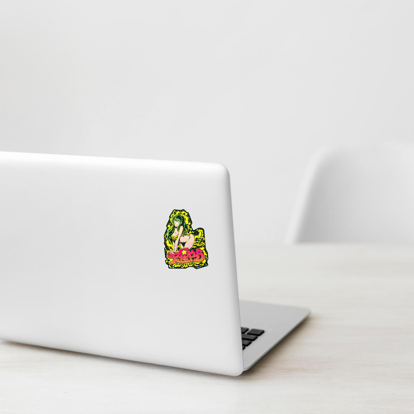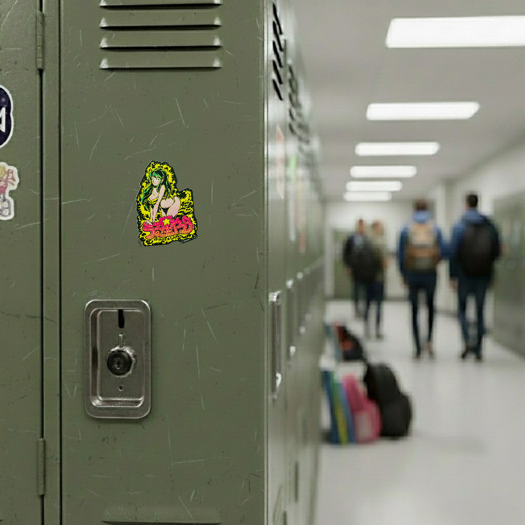 This bold B-Side Label sticker captures Lum Invader from the iconic series *Urusei Yatsura* in her signature tiger-striped outfit and electric green hair, surrounded by a vivid burst of yellow energy. The striking neon palette and confident pose perfectly express Lum’s playful charm and cosmic power. A true tribute to one of anime’s most beloved and mischievous heroines.
