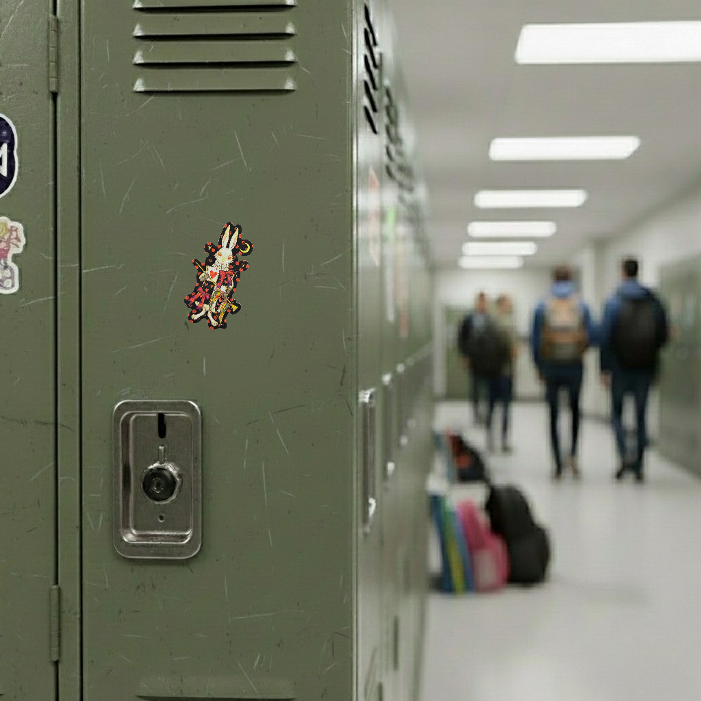 Step into a dreamlike wonderland with this hauntingly stylish rabbit sticker. Dressed in an ornate outfit of hearts, ribbons, and gold accents, this surreal bunny feels straight out of a dark fairytale. Mysterious yet playful, it’s perfect for fans of gothic fantasy and eccentric design.