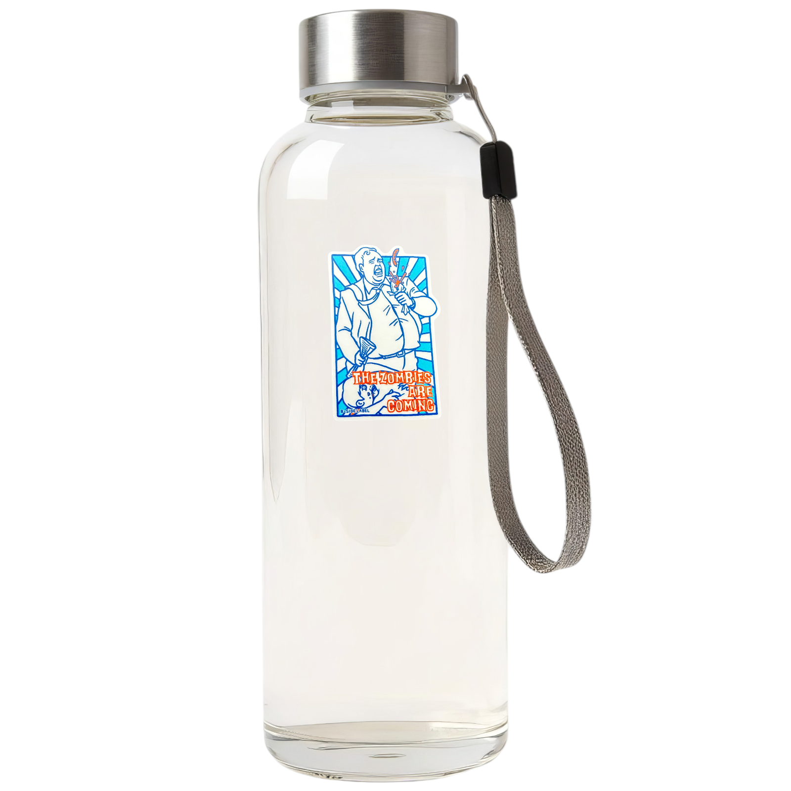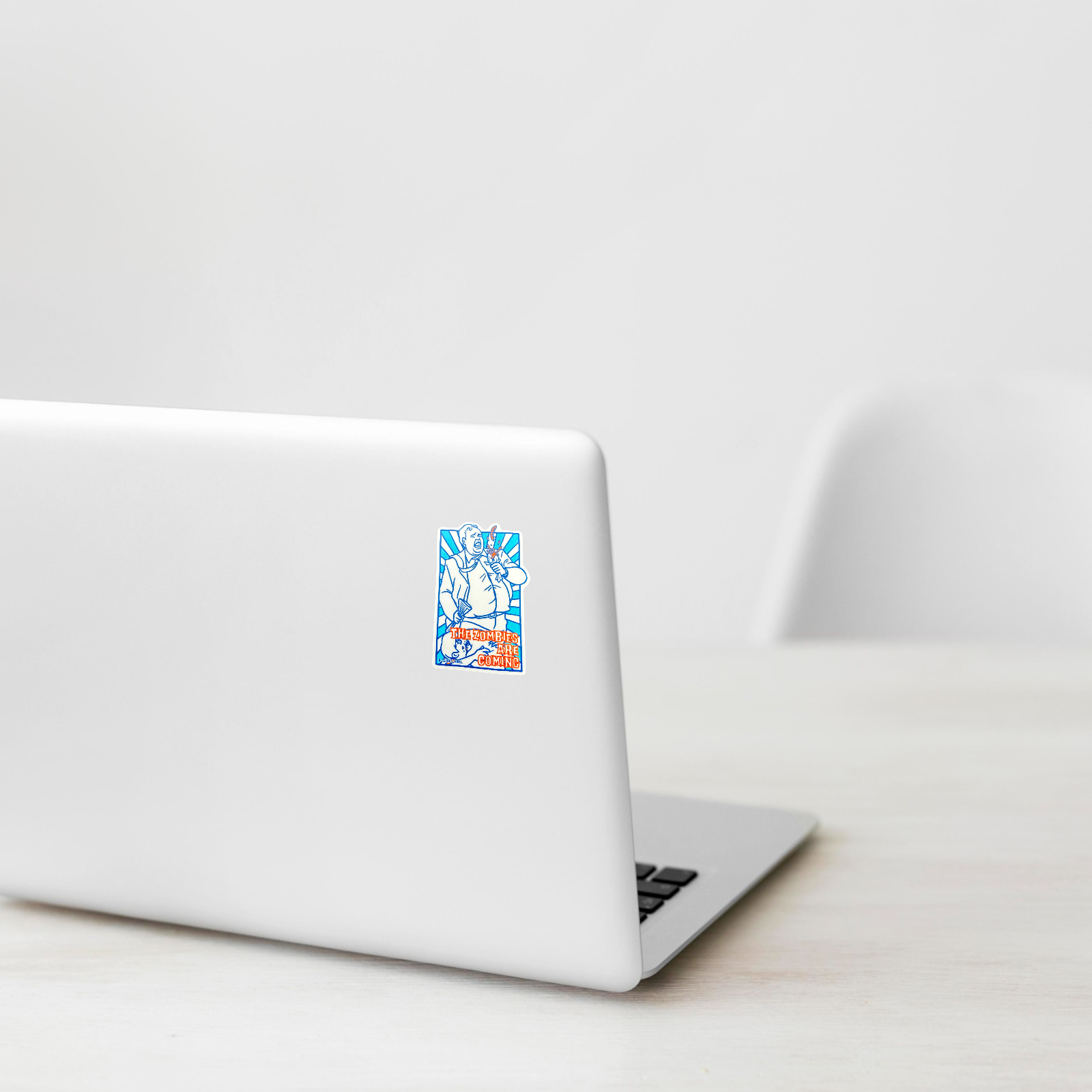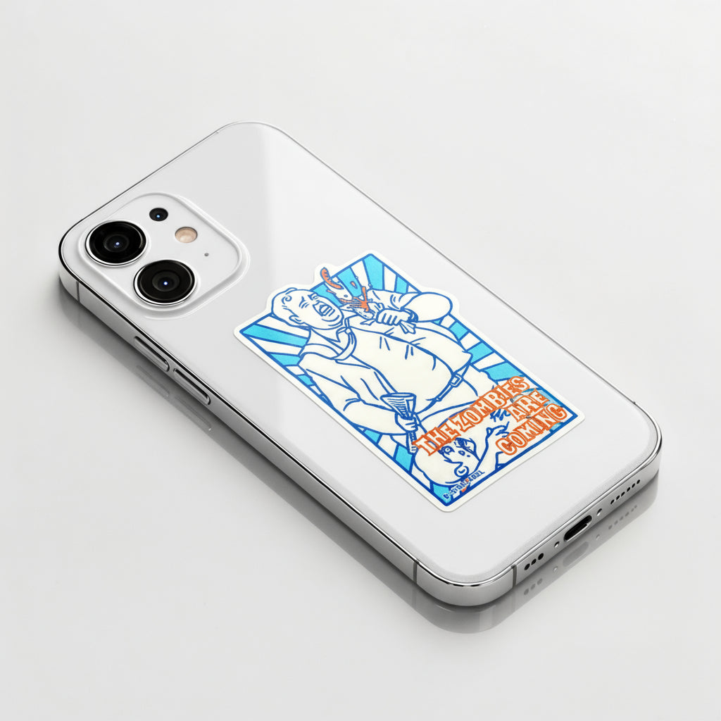 Apocalypse now, but make it campy! This B-Side Label sticker captures a hilariously over-the-top reaction as a man defends himself from the undead—complete with bold comic-style lines and vibrant blue-and-orange tones that scream vintage panic poster.